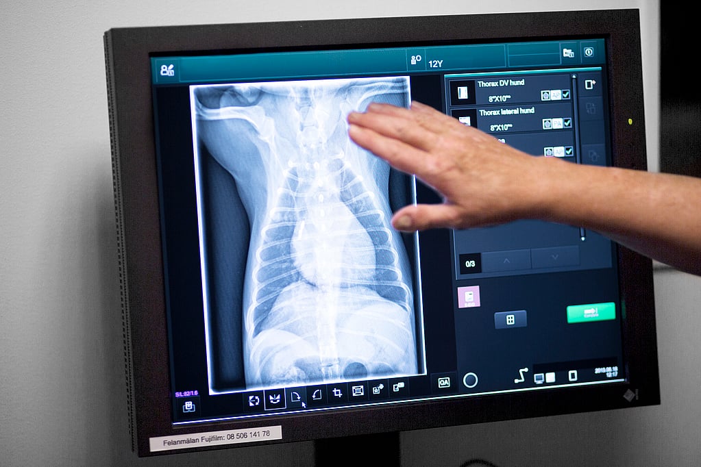 Les rayons X traversent plus ou moins facilement les différents tissus : ils passent aisément à travers les muscles et les tissus mous, mais sont freinés par les os, plus denses. Cette différence de pénétration crée une image contrastée : le squelette apparaît en blanc, les organes et muscles en différentes nuances de gris, et les zones remplies d’air, comme les poumons, en noir. Une fois l’examen terminé, il n’y a aucune radiation résiduelle dans le corps de l’animal ni dans la pièce où il a été réalisé.